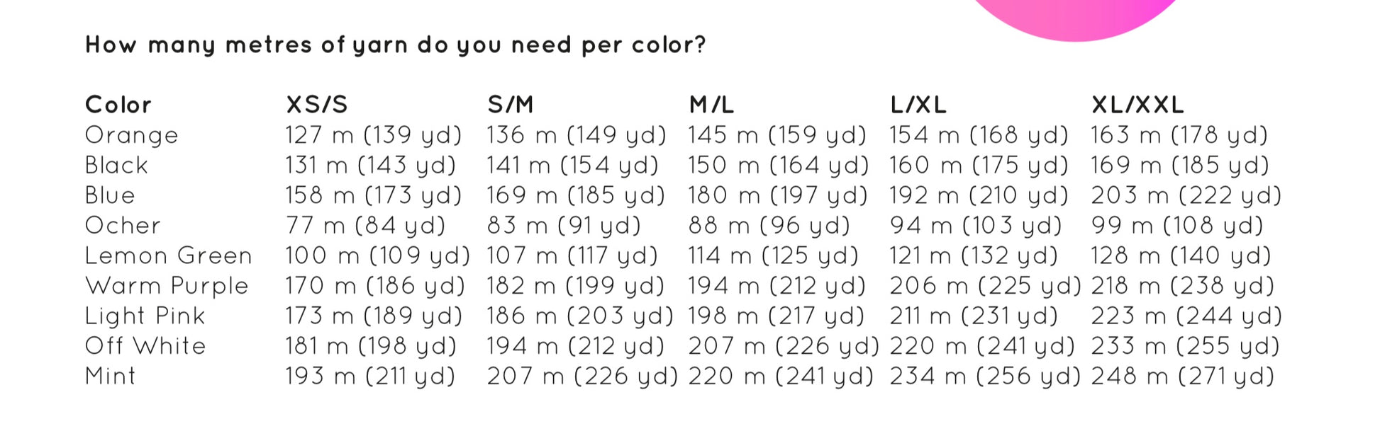 How much yarn do you need in total per color for size XS, S, M, L and XL?